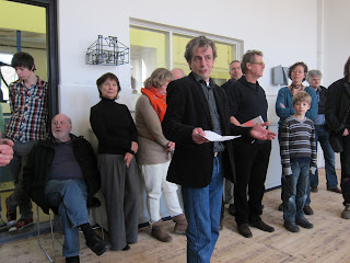 In de voortuin (voorheen schoolplein) staat het verkiezingsbord nog: nu in beslag genomen door AlleskAn. Hieronder Hans Muiderman tijdens de opening (foto Marcel Prins).